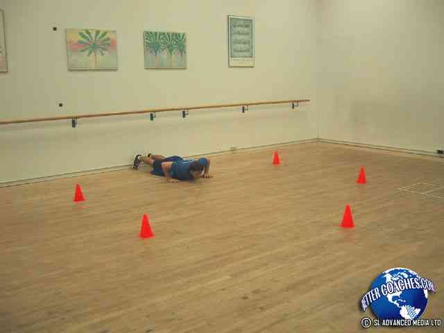 Starting from a push up position, athlete gets up and shuffles to the cone directly to his left. After touching the cone, athlete returns to push up position at the starting point. This is repeated until all the cones have been touched in a clockwise fashion (this drill can also be done in the reverse direction).