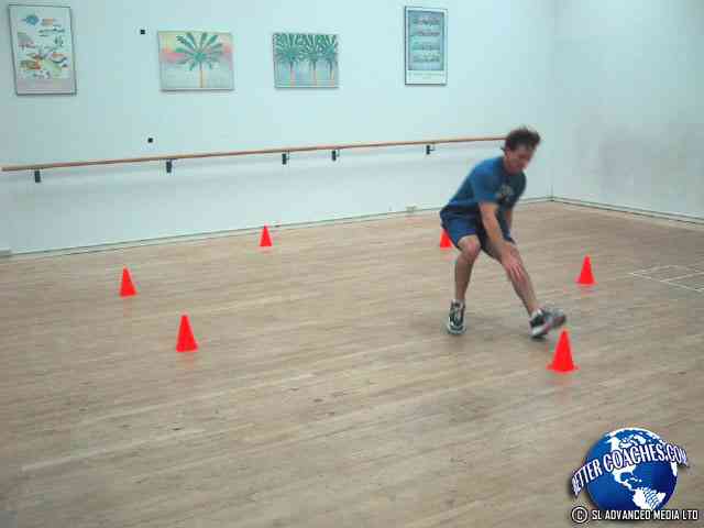 From starting point, athlete sprints forward to top middle cone directly opposite him. After touching cone, athlete moves to back left cone, then front right cone, then front left cone, then back right cone, then top middle cone, then back to start position, then sprints through middle cone to finish.