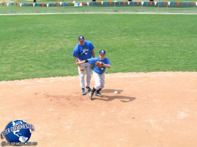 The coach stands behind the infielder and bounces the baseball anywhere out in front.