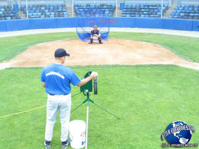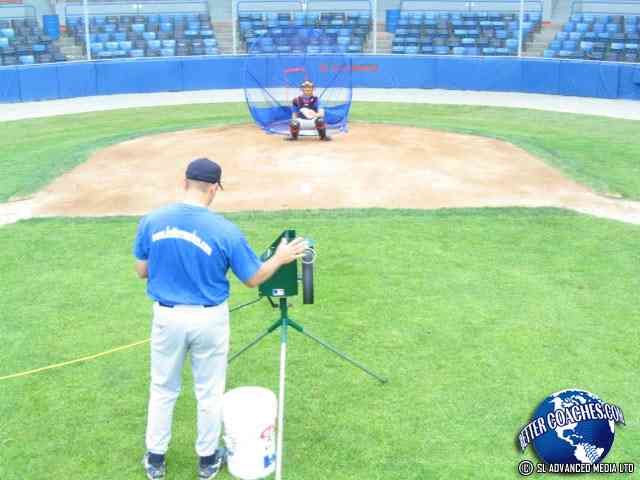 Phase 1: The catcher sets up behind the plate while the feeder of the machine places six to eight baseballs in succession.