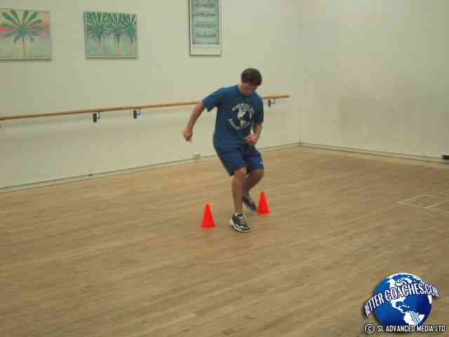• Around and through: Using a "figure-8" pattern, athlete shuffles both feet around first cone, crosses over and moves both feet around opposite cone (this drill can also be done in the reverse direction).