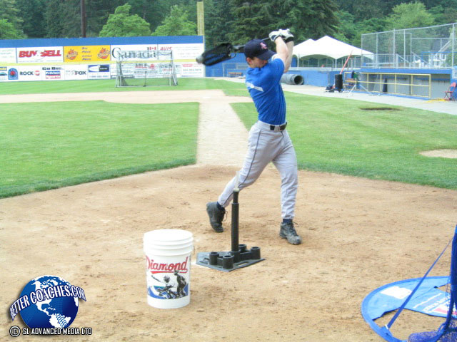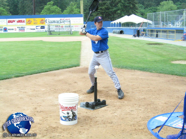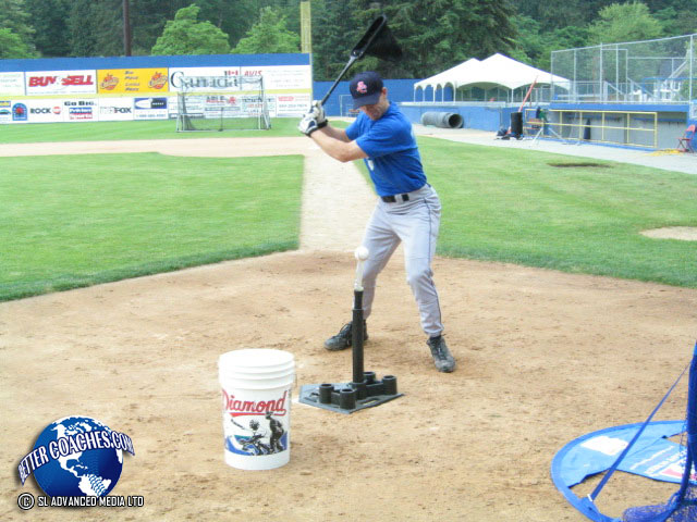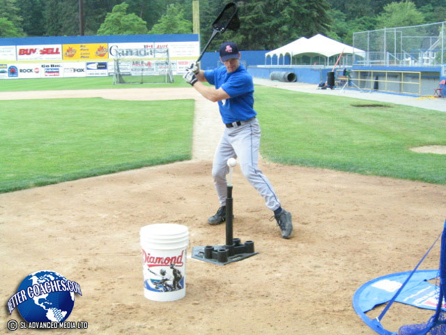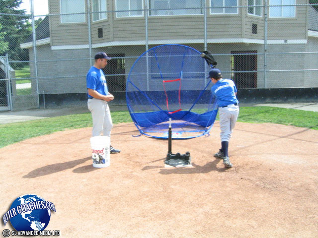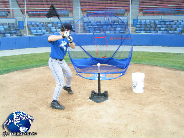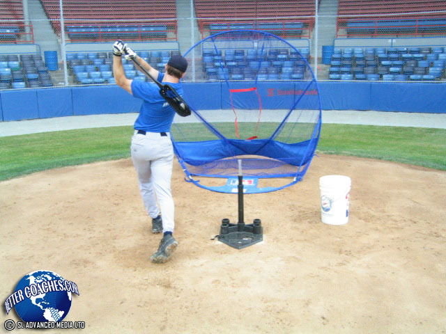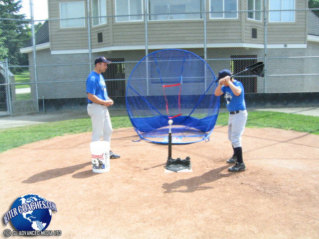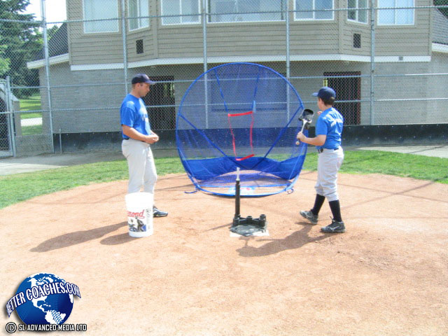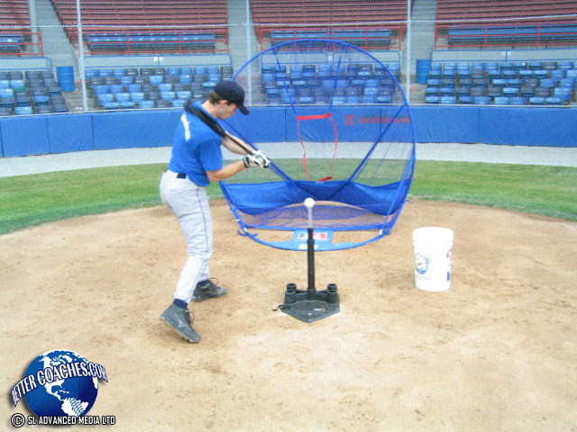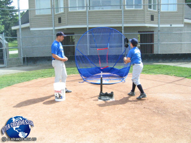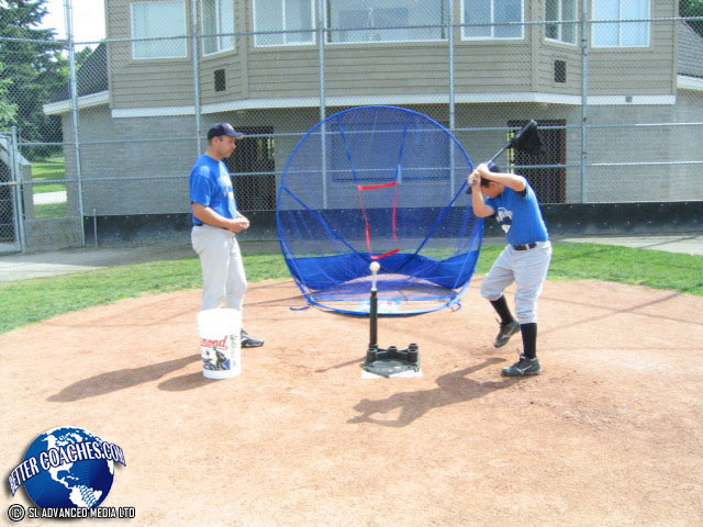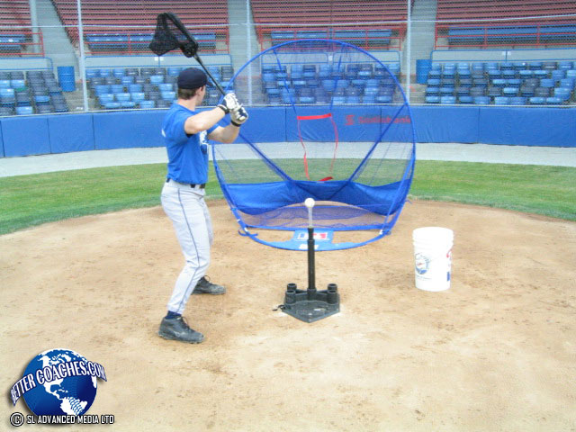 The baseball should enter the net; replace the baseball back on top of the tee.