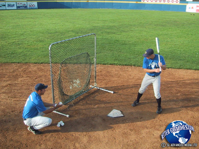 It may be easier for the hitter to do this drill if they choke up slightly on the bat.