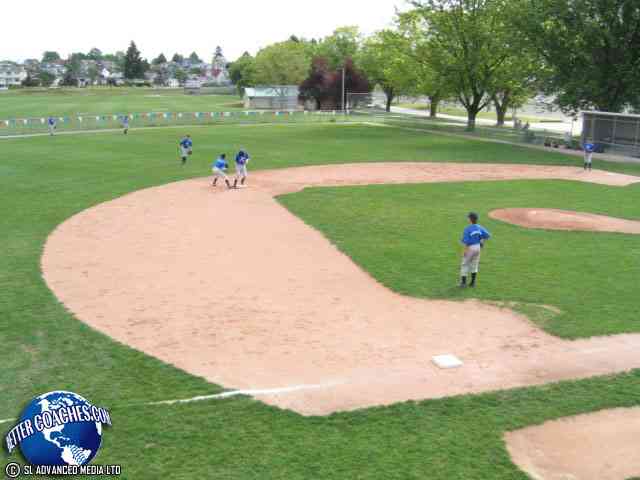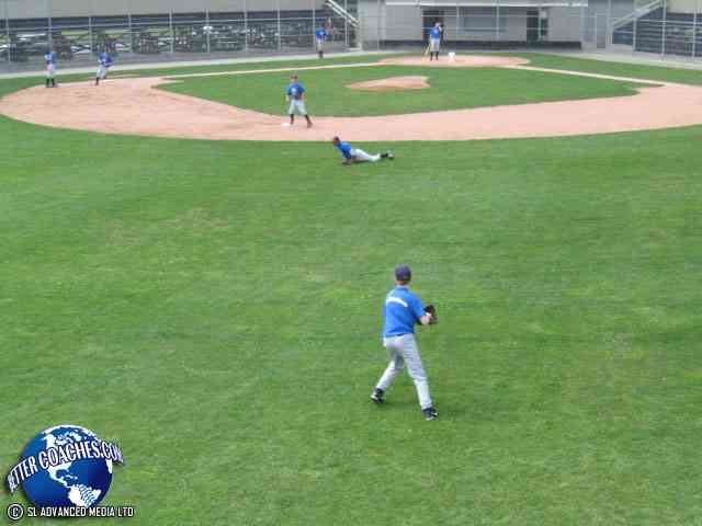 The base runner starts at home plate waiting for the coach to hit the ball into the outfield. (Video 1) (Video 2) (Video 3)